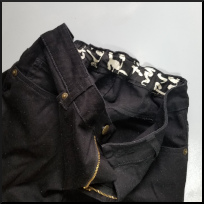 足の部分がぴっちりでもなく太過ぎもしない、その頃合いが絶妙で気に入っていたパンツですが、ウェストがどうもゆるめで動くたびにずり落ちてきます。ベルトを使うのは面倒くさい、というわけでウェスト部分に穴をあけてゴムを通そうと思いましたが、ボタンホールのような穴をあけるのも億劫。手近に端切れがあったので、ゴムを通せるよう縫い付けました。
