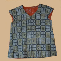 白地に水色の模様が入った羽織。よく見ると松、竹、梅、水仙、菊、川の流れ、あずまや風の建物など、和柄のオンパレード。かなり古そうなので、いわゆるアッパッパのつもりで袖なし、襟なしのお尻が隠れる丈のブラウスを作りました。頭が入るぎりぎりの襟あきで、超簡単。