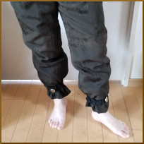 だいぶ前に防寒用に作った裏付きのパンツ。やや太めのため家で普段使いするには足元がもたつく感じがします。細めにサイズダウンしようかと思いましたが面倒くさいので、端切れで足首バンドを作りました。アームバンドの足首版というところでしょうか。輪っかにしてしまわず、大きめのボタンを付け、ゴムの先端を輪にし、ボタンにひっかけて着脱できるようにしました。